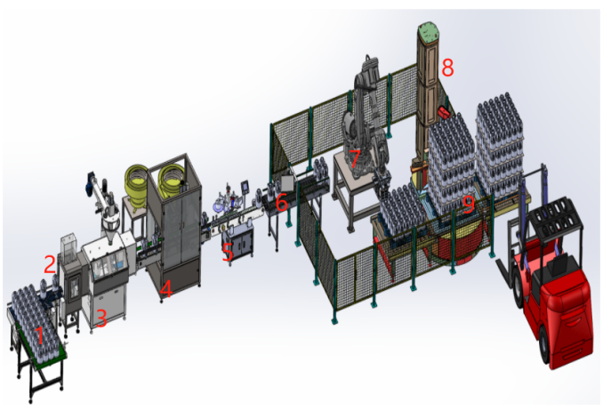 1. 理灌 2.充氮气洗瓶 3.密闭灌装 4.旋盖压盖一体机 5.贴标机 6.在线分道机构 7.全自动机器人码垛系统 8、9在线缠绕覆膜机